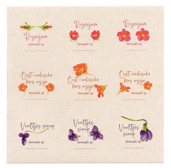 Overzicht6 vierkante postkaarten met mooi geïllustreerde bloemenrecepten + 18 leuke stickers