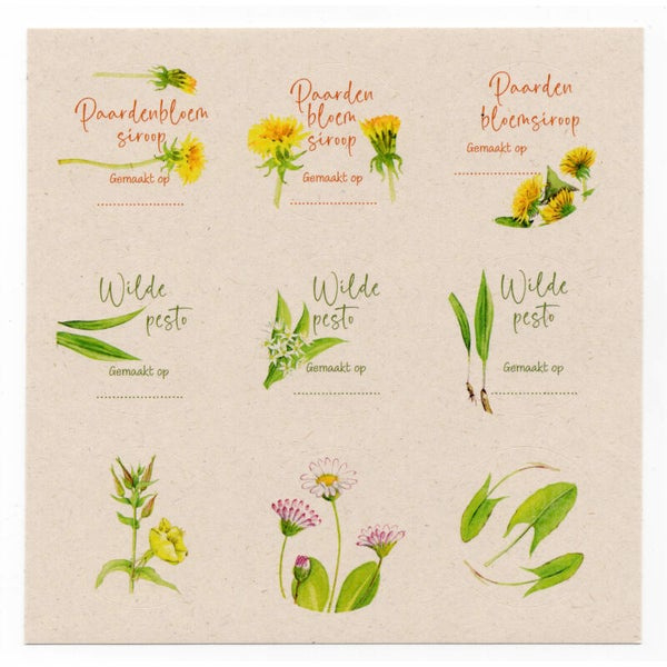 Overzicht6 vierkante postkaarten met mooi geïllustreerde wildplukrecepten + 18 leuke stickers