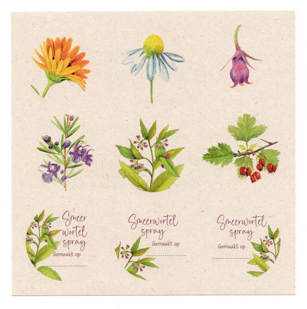 Overzicht6 vierkante postkaarten met mooi geïllustreerde kruidenrecepten + 18 leuke stickers