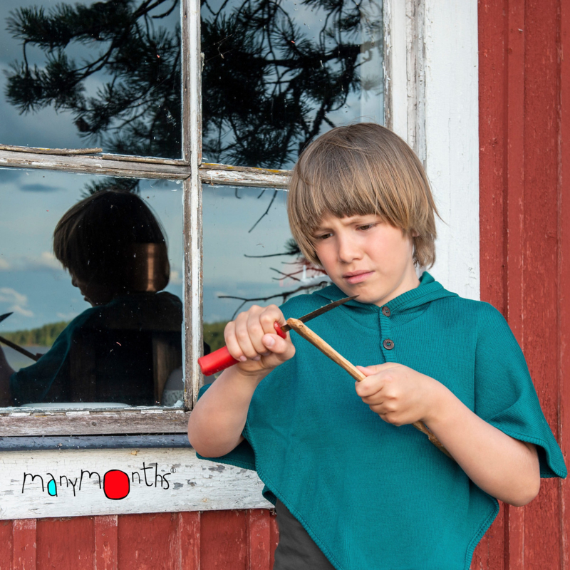 Some kindergartens and schools prohibit the use of hoods and strings for safety reasons, thus the Multi-Cape has been designed to be a one-piece item with a lovely coconut button closure. The back is longer than the front to give warmth and allow for a multitude of use.