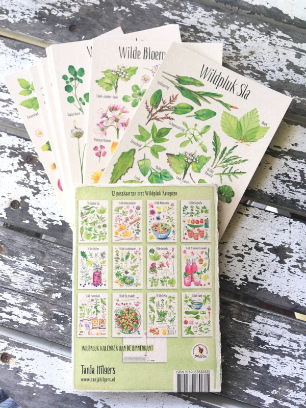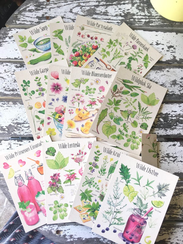 Overzicht12 Postkaarten met mooi geïllustreerde wildpluk recepten.