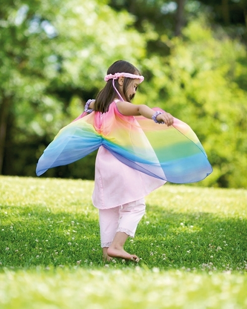 OverzichtMagische jurk voor elke fee! De jurk is gemaakt van zachte, extra zware kwaliteit zijde en zijde georgette vleugels in een prachtig regenboog patroon. De elastische hals maakt de jurk gemakkelijk voor het kind om zelf aan en uit te trekken.