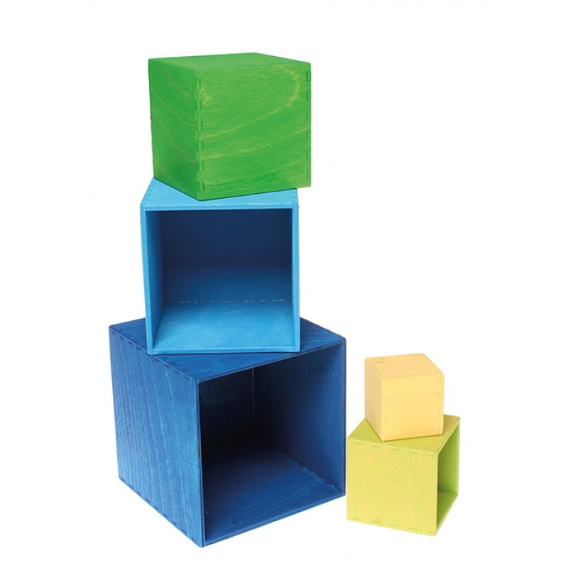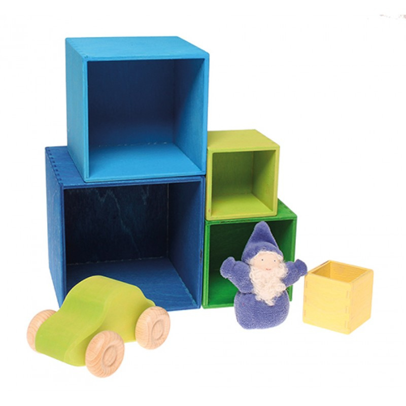 OverzichtThe Set of Boxes is a versatile toy for the children: they can stack and sort the boxes by size and colour, build with them, use it as doll house or car port, collect treasures etc. Materials: ply wood, non-toxic water based color stain....