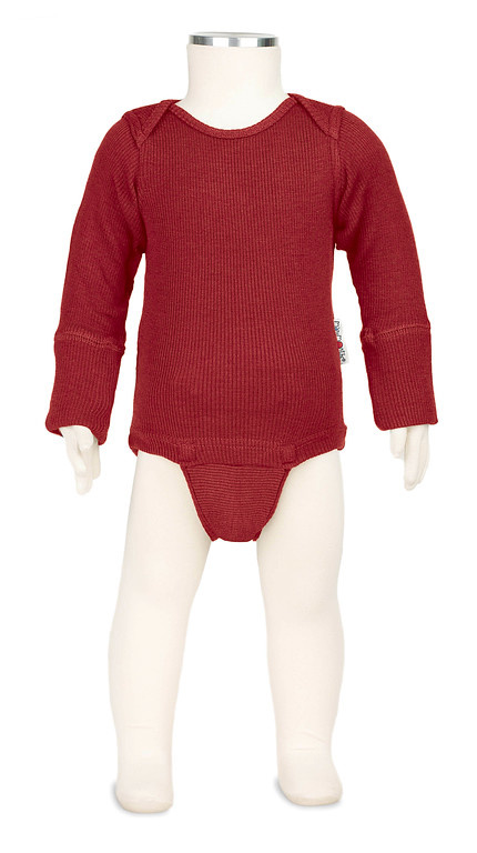 100% merino wool is the greatest material for a bodysuit. The naturally curly merino wool fibres trap air and baby will feel wonderfully warm or cool during the warmer months. Wool is fully breathable and it can absorb about a third of its own weight in fluid before feeling wet or even damp. If the outerwear leaks through in puddle play or snow, not to worry, baby will stay wonderfully warm and healthy, the body temperature at its optimum comfort level. Woollen underwear help to adjust body temperature keeping it optimal by matching temperature and moisture on the skin.